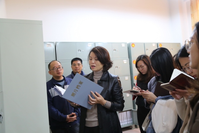 第一阶段,与会活动人员集中到东升中学档案馆进行实物参观。梁老师就东升中学档案布局、实物陈列以及文本文档应该如何摆放陈列,以及档案室管理进行了现场指导讲解。她提醒参观人员,档案陈列摆放以及档案室管理要做到细致规范。就各中小学档案管理员提出的问题,梁老师给予了细致解答。