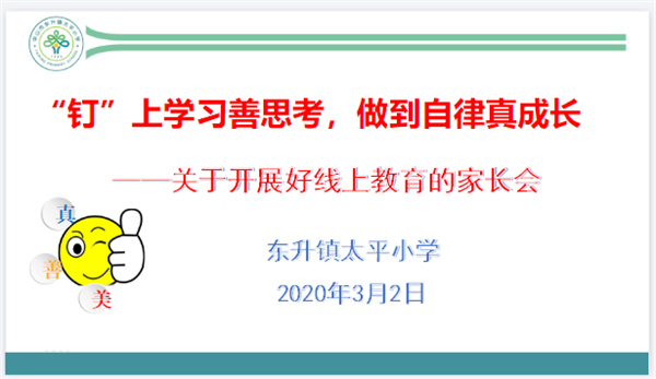 因新冠状病毒肺炎的影响,学校依旧未能正常开学。为了在疫情期间也能加强家校沟通,让家长更好地了解学校工作和线上学习相关要求,共同促进学生的健康发展,达到家校共育的一致性和有效性。3月2日晚上,太平小学利用钉钉平台在线开展“‘钉’上学习善思考,做到自律真成长”主题家长会。