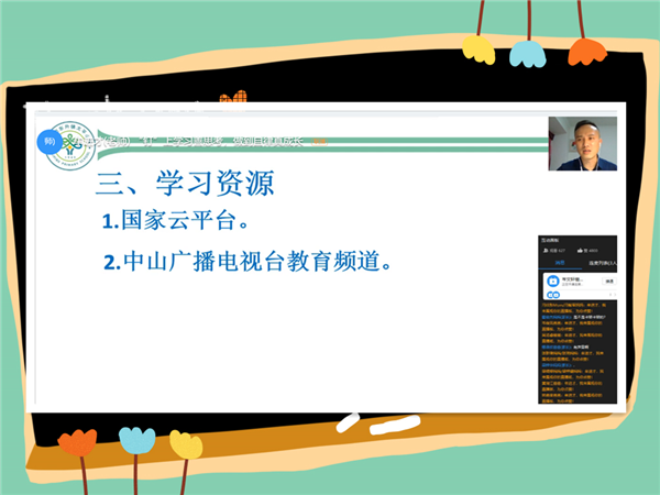 晚上8点,牟进才主任准时发起直播。牟主任在会议时详细讲述了学校关于线上学习、线上教育的实施和具体安排,表明学校是根据省市文件指引组织开展线上教育。学校遵循着“五育并举”“线上线下相结合”等原则合理安排每日课程,鼓励学生自学为主,教师在线辅导。