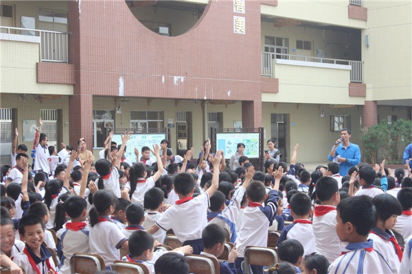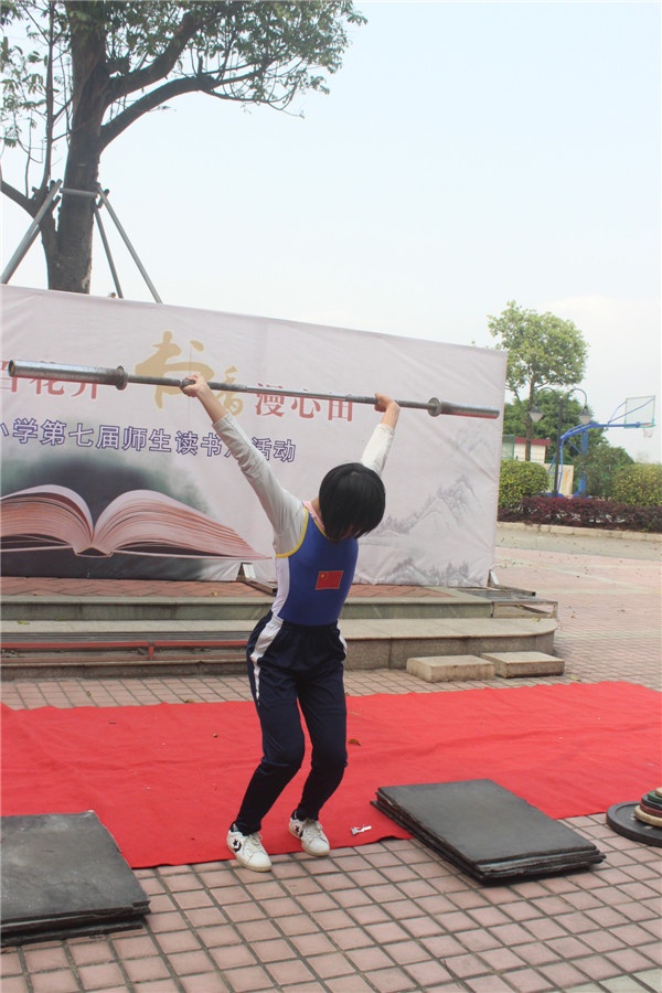 下午3点钟,学生有序搬着椅子到小操场集合。首先由体育老师卢锡有跟学生讲解举重的相关知识,接着进行的是举重队员的举重展示。伴随着阵阵掌声,举重队员纷纷上场。首先是抓举,梁铟琪同学落落大方走到杠铃前,一、二、三,稳稳当当地举起了第一把,接着一个个运动员成功试举了第一把。接着进行的是挺举,随着体育老师的一声声“成功”,各个举重健儿们又成功举起了第一把。同学们认真地观看比赛,有的同学看着看着,不自觉站了起来。活动的最后一项是进行举重知识有奖问答。在回答问题的过程中,学生踊跃举手回答问题,气氛相当活跃。