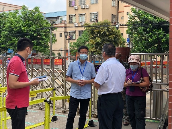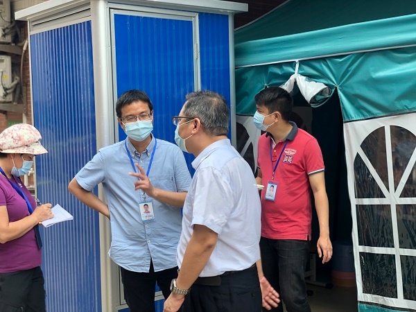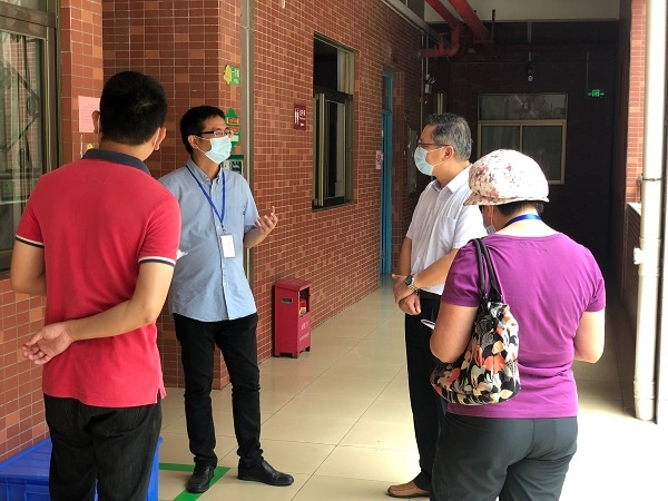 市委疫情防控督察组在罗东校长以及多名学校行政的陪同下巡视了校园,对学校疫情防控的各个区域进行检查。从学生入校离校的门口、校医卫生室、健康观察室、学生饮水处、学生厕所,再到课室,其中重点关注了入校缓冲区、体温检测区、临时隔离观察区等防疫区域以及课室的布置和预防交叉感染工作流程。