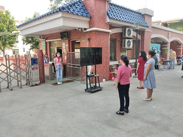 “学生”按指示牌要求前后相间一米成两路纵队步行,经过保安室门前体温检测区进校门。红外线体温自动探测仪器可以同时跟踪多个目标进行测温,经过的每个同学的头像及额温均显示在屏幕,如果有体温超过37.3度的则会自动报警提醒。站在屏幕前的值日老师也在密切监视,如果发现体温接近发烧线的则再用人工探测仪复查。