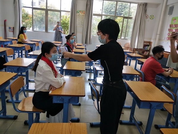 其中大致分为两种状况。第一种,体温合格的有序进入学校,踩过消毒地毯,到保安室窗前洗手台按“七步洗手法”洗手,然后按路线间隔1米以上、安静、有序地进入到教室。整个过程都有值日老师在指导和监督。第二种,入校时当值日老师发现一名学生体温超过了37.3,其中一名值日老师立即将其带到临时健康观察室。到达观察室后,医护组人员帮其重测体温,并询问近期是否有流行病学史:14天内有无湖北等重点地区旅居史、途经史,或有无与确诊、疑似病例接触史,或者有无与境外、国外人员接触史等。若该同学说均没有,则医护组人员打电话通知家长再次询问核实,并通知家长前来学校,带小孩回家休息观察或者适时就医。若有发烧而且有流行病学史的同学,则马上通知学校疫情报告人陈福业主任。接报告后,学校疫情防控领导小组马上启动应急预案,通知东升医院派车前来接诊转运,通知镇疾控中心、镇文体教育局协助排查和调查。学校疫情排查统计组、线上教育及开学调控组、疫情防控宣传与舆论导向组、疫情处置组、教职工健康监控组各司其职,立即采取相关的防控措施。