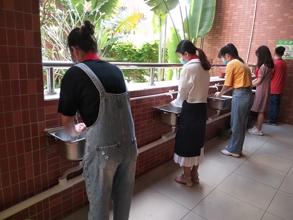 上午最后一节课下课了,上课老师指挥好学生间隔1米有序排队,带领学生到洗手池进行手部清洁,按“七步洗手法”使用洗手液、流动自来水清洁双手,用干净纸巾擦干。洗手后,老师指挥学生有序地回到教室坐好,按照单双小组先后就餐顺序,到教室门外领饭。然后回到座位摘下并正确折叠保存好口罩,安静地坐好吃饭,避免交谈聊天。期间有个同学打喷嚏、咳嗽,老师指导他用纸巾捂住口鼻或采取肘部遮掩。用餐后,学生用湿纸巾抹干净嘴巴,戴上口罩,按要求有序地到教室外面摆放好餐具。