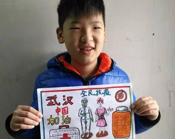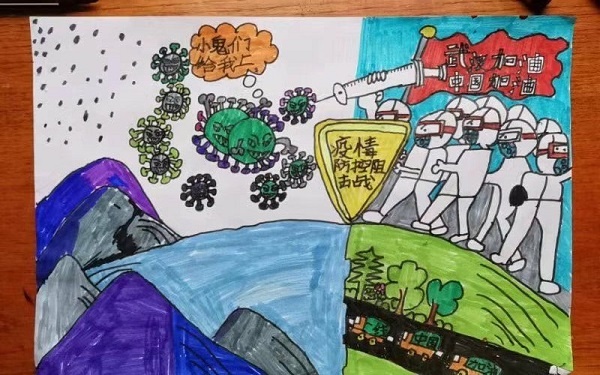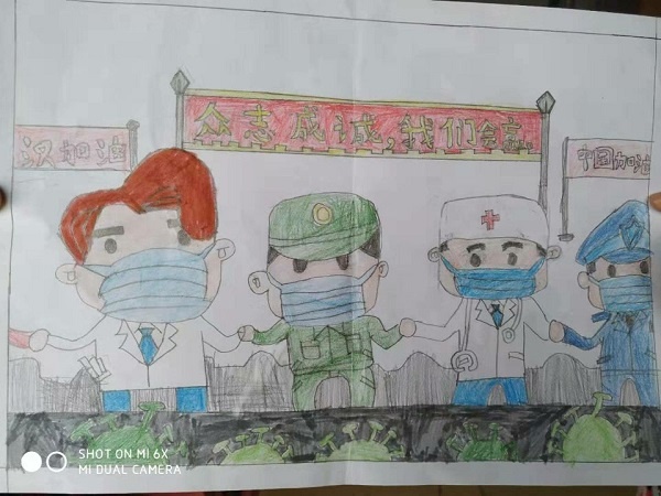 活动信息一发出,孩子们一如既往地积极配合做好相应任务。据班主任反映,从23日起就陆陆续续收到了孩子们的海报作品。可见孩子们的高涨热情。收集起来的海报设计形式多样,有线条画的,有水彩画的,还有简笔画的,有些混合有文字以表达自己强烈内心感受的等等。从孩子的作品内容中可以看到,那点点水墨,那一笔一画,都是他们用心用情专注完成的。从中,大家也能感受到孩子们盼望祖国尽早走出疫情阴霾的急切心情,更能够看出孩子们作为祖国的一员的责任心——祖国有需要,自己就要出一份力的高度责任感。