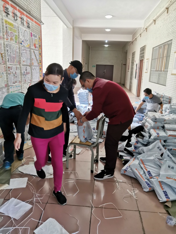 2月29日,东升中学部分教职员工在吴耀光校长的带领下,分装打包学生教材近20000本,并与邮政快递公司紧密合作,将学生教材以最安全和最快捷的方式点对点地寄达学生手上。