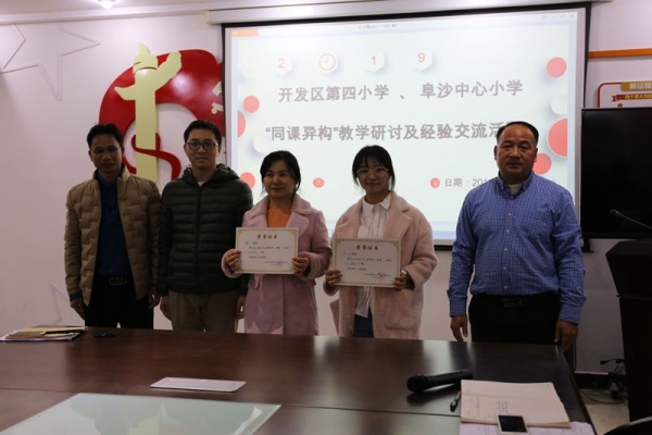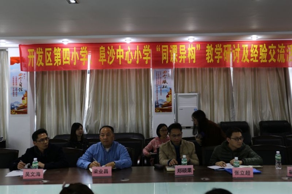 同课异构,协同并进!为了促进教师专业成长和数学科组建设与发展,2019年12月3日,阜沙中心小学数学组与开发区第四小学数学组共同在开发区第四小学开展同课异构教学研讨及经验交流活动。出席活动的有两校的校长梁业昌、郑硕果,开发区中心教研组成员张立超以及两校全体数学老师。