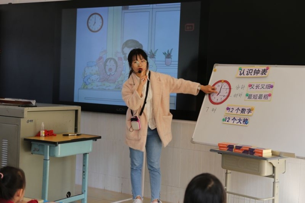 活动开始,首先由开发区第四小学章希老师讲授一年级数学课《认识钟表》,章老师非常重视学生说的能力,高度完成了本节课的教学目标,通过让学生说一说,拨一拨,写一写,既让学生亲身体验数学来源于生活,又能帮助学生积累活动经验。