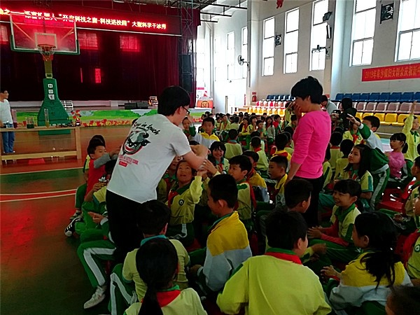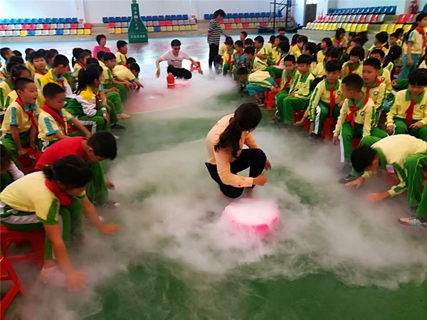 为了普及科学知识,营造讲科学、学科学、用科学的良好氛围,阜沙中心小学举行丰富多彩的科技节活动,目的是传播科学知识,弘扬科学精神,推动学校科普活动的开展。本次活动的主题是:“开启科学之窗--科技进校园”大型科学干冰秀,邀请高博教育的讲师为师生表演。整个活动分为五个环节:神奇的现象、触摸干冰、品尝干冰、用干冰洗澡、去太上老君宫殿,各环节讲师以情境导入,讲故事的形式,引导学生积极思考,细心观察,亲身体验,感受干冰的各种特征,活动设计巧妙,语言表达引人入胜,体验安排到位,人人都能参与其中,不知不觉中,让学生认识干冰是零下78.5摄氏度的固态二氧化碳,升华成气体的二氧化碳是无色无味的,可乐、啤酒等里面存在的气体就是二氧化碳。最精彩的是最后环节,当学生们闭上眼睛,讲师数到30秒再打开眼睛时,眼前满地是云雾,仿佛真是上到了天宫一样,学生们兴奋地用手抱云雾,场面又一次热闹起来。
