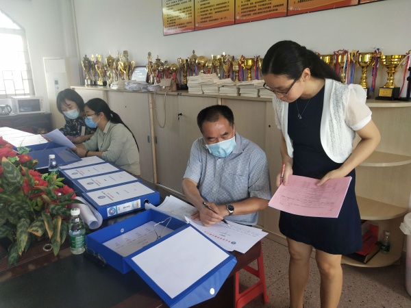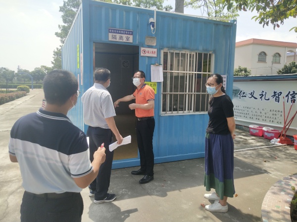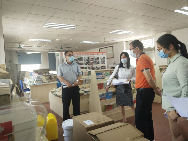 上午,由阜沙镇教育事务指导中心主任徐瑞欣 、教研员吴雪仪等组成的防疫专班工作组首先进入学校会议室,按照《中山市中小学校幼儿园学生返校准备工作验收表》,逐一查阅、核对了相关资料。紧接着,工作组对学校教室、图书馆、卫生间、功能场室、隔离室等各场所的环境卫生和防疫应急相关设施进行核查,边走边看,边听取詹前秒校长汇报学校防控工作和学生返校准备情况。检查过后,工作组成员将核查过程中发现的问题及时向学校行政进行了反馈和汇总。