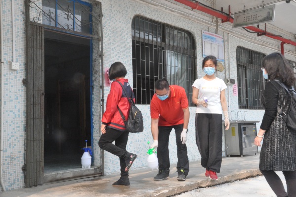 这次演练以郑新为组长、副组长梁荣忠、 健康副校长杨洁炜,整个演练设立疫情演练评估,疫情监测,现场消毒,信息排查,疫情隔离以及宣疫情传维稳等环节。演练全体老师扮学生排队等候进入校园,戴口罩,手持健康卡,并保持一米间距分两条通道有序进入校园。学生进入学校时要依次走过测温区,检测人员在二边用测温仪对学生逐个进行体温检测,并对学生自行车、书包等物品进行消毒。体温正常、无其他症状者,有序进入班级上课。对于体温异常的学生由专人带至隔离区, 送至复测区,由校医再次用水银温度计对学生体温进行检测。同时将此生经过的通道消毒并封闭。学生进入课室前再次由班主任进行体温测试,并做好登记。对于学生在课堂中出现身体发热突发事件,学校工作小组也是做了周密的应对部署。