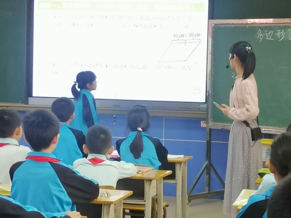 活动首先由陈芳兰老师带领五(1)班的孩子结合一体机和希沃软件的使用上了一节精彩的复习课,结合多边形面积的练习开展授课。陈老师以小组自治、合作纠错引入,引导学生回忆单元知识,建立知识框架。其次的师生一同总结单元错题原因:第一,不注意单位,不会举一反三;第二,没有沟通好图形之间的练习;第三,读题能力弱,找数据不准;第四,不会借助图形结合解决问题。随后陈老师逐一问题结合练习攻破,帮助学生巩固知识。在课堂上,学生真正成为学习的主人,积极参与教学的每一个环节,努力地探索解决问题的方法,大胆地发表自己的观点。在评课议课环节,评课老师表示通过小组合作学习,学生思维得到锻炼和发展。