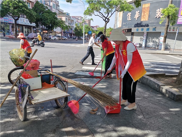 党员志愿者及教师服务队早早就集中到学校门口,对附近的街道进行大清扫,清理地面、清理杂物和垃圾,彻底清理卫生死角。他们一手拿着扫把、一手拿着垃圾铲等劳动工具,分工合作,顶着烈日,埋头干起来。