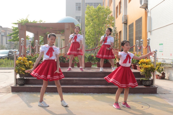 这时,升旗台前忽然出现了四位美丽可爱的“小精灵”。美妙的音乐悠扬响起,跟随着音乐,小精灵们边唱歌边跳起了优美的舞蹈。两旁四(1)和四(2)班的同学们也伴随着音乐自信地唱了起来。歌声是如此动听,舞姿是如此优美,台下的老师和同学被这突如其来的惊喜感染了,完全沉浸其中,甚至情不自禁地跟着哼了起来。原来这就是凝聚了全校师生的智慧,经大家共同努力创作而成的新校歌——《星空体育幸福快乐成长》呀!在这特别的日子里首次亮相,真是一份意义非凡的开学礼物啊!