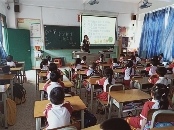 当天的升旗仪式上,学校大队委曾凡苑老师进行了主题为“爱牙护牙,从小做起”的国旗下讲话,曾老师提醒同学们在享受快乐生活的同时,别忘了关注自己的口腔健康,号召同学们要积极行动起来,努力做到从小爱牙护牙,拥有一副健康洁白的牙齿。下午,学校组织了低年级的班级开展了一次“爱牙护牙”主题班会课,班会课上,根据一年级学生正处于换牙阶段,班主任们向同学们介绍了换牙期间的注意事项,并通过故事、小游戏、图片和视频等形式向同学们讲述了牙齿的构成及其作用。以“全国爱牙日”为契机,针对龋齿带来的危害,班主任们还介绍了保护牙齿的方法,有效地宣传了如何预防龋齿、减少口腔疾病,让孩子们更好地保护自己的牙齿。此外,学校还利用张贴宣传展示栏图片的形式引导学生早晚正确刷牙,帮助孩子们养成良好的生活卫生习惯。