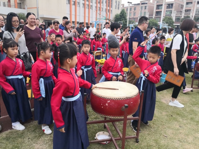 古人云:“童蒙之学,始于衣冠;先正衣冠,后明事理”。家长们首先为孩子们整理衣冠,使孩子心中有了塑造清明心智的第一意识。接着,中心小学垂髫学童拱手拜孔子像,鞠躬敬老师,谢师恩。资深老师们逐个为孩子们点朱砂,眉心之间轻轻一摁,一点朱砂如智慧天眼印在孩子们的额头上,寓意孩子们踏入智慧启迪的大门。带着对未来的无限向往,孩子们在激昂铿锵的鼓声中击鼓明志,告别蒙昧,扬帆起航。学校肖炜林老师为孩子们示范书写“人”字。家长们握着孩子的手,饱蘸浓墨,在纸张上一撇一捺共同写下一个“人”字,希望每个孩子都能尽其一生去认真书写自己的人生篇章。