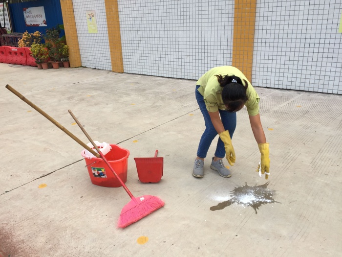 值日老师指引在校道放学的学生让开一条通道,让班主任带呕吐学生到隔离区等候,戴好手套帮学生测量体温,随即电话通知家长过来带学生到医院看病。同时,值日老师立马打电话通知值日行政,值日行政再通知清洁阿姨马上过来对呕吐物进行清理消毒。学校按照疫情防控工作专班的工作处置流程要求,逐级汇报。学校相关领导和部门迅速响应,启动应急预案,按流程处置。这次应急演练,学校各成员职责明确、流程清晰、协同有力、处置得当,达到了预期效果。