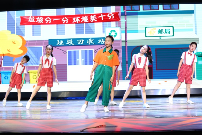 歌舞剧《垃圾王的故事》立足环保,从校园生活入手,12名学生用唱跳结合的方式讲述了“垃圾王”做好事并带领同学进行垃圾分类的故事。从十月初接到比赛通知开始,杨楚楚、周金波、林群三位指导老师便开始落实剧本撰写、角色筛选及排练等相关事宜。定下角色之后便开始了一日三次的排练,晨间的乐器室、午休和放学的舞蹈房都见证了老师和孩子们为了此次戏剧比赛反复练习、挥汗如雨的样子。
