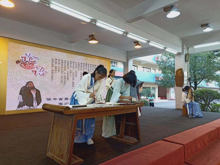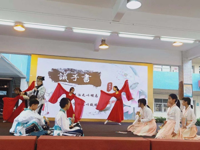 决赛在同学们的欢呼声中拉开序幕。率先登场的是《琴声悦耳书墨赏心——<论语>经典诵读》节目。有道是:“天不生仲尼,万古如长夜”,在悦耳的琵琶声中星空体育一览圣人之风采,重温圣人之教诲。接着是《苏轼词三首》,须眉多铁骨,殊不知柔肠也丈夫。6名演出者一袭青衣,演不尽的是苏轼的俊逸与浪漫,道不完的是他的乐观与旷达,两名舞者在旁循声起舞,好不让人心生欢喜!诸葛家书代代传,修身立德孝圣贤。一(12)的《诫子书》把现场的氛围燃至了最高点。一个可爱的“诸葛亮”缓缓向舞台中央走去,手持羽毛扇,头戴纶巾,在学童心间播撒智慧的种子;12名“学童”席地而坐,吟诵着圣贤之语;3名红衣舞者应节而舞,给人以视觉听觉极大的享受。