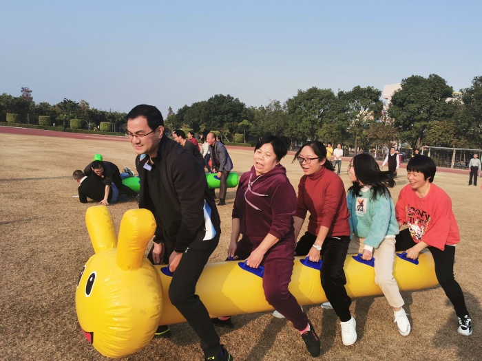 和煦的阳光照在人们的身上暖洋洋的,足球场上都是欢声笑语。本次活动以科组为单位分小组进行,内容包括“毛毛虫向前冲”、“不倒森林”和“一转到底”等趣味游戏项目。学校工会主席莫谋珍介绍游戏规则,接着宣布活动开始,点燃了大家的热情。其中“毛毛虫向前冲”最为有趣,场上各科组老师排成一队,跨坐在胖胖的“毛毛虫”身上,一起喊着口号,提着毛毛虫卯足干劲向前冲,活动场面精彩不断,热闹非凡。“毛毛虫”项目老师们体验到运动的快乐,也增强了老师们的团结合作意识。