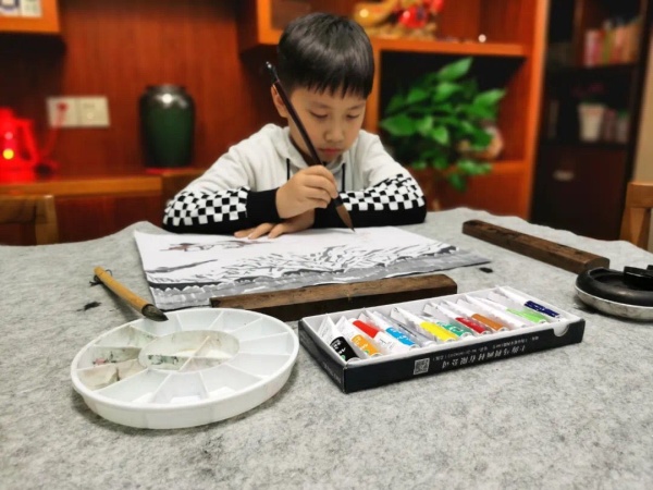 此外,在连续四周的美术线上教学中,郭老师还推出了《春晓诗意图》《只在此山中》等儿童山水画题材美术课程,均取源于小学经典的唐诗。系列的特色国画课受到了广大学生和家长的积极参与,诞生了一批特色鲜明、文艺而童真的山水画作品。