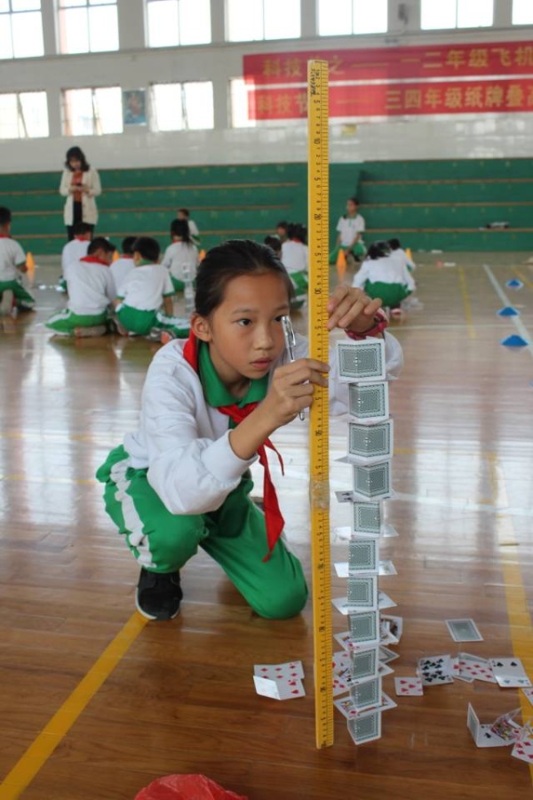 针对学生的年龄特点,比赛分低、中、高三个学段来进行。其中,一二年级举行的活动是手掷纸飞机,飞向科技的殿堂。孩子们带来了亲手设计的纸飞机,他们那信心十足的神情,跃跃欲试的姿态,让比赛现场变得欢快起来。在裁判的组织下,孩子们用有力的臂膀放飞手中的纸飞机,放飞他们美好的飞天梦。三四年级开展了纸牌搭高活动,裁判一声令下,场上马上沸腾了起来。孩子们通过巧手搭起奇妙的高塔,感受科技的魅力。五六年级举行了“鸡蛋撞地球”的比赛,当参赛者们的作品一个一个丢下来的时候,所有同学们的心都被牵动着,同学们有时因为“鸡蛋”安全着陆而欢呼鼓掌,有时因为作品的奇葩思路而开怀大笑,有时因为鸡蛋碎裂而叹息。这一挑战不但给同学们提供展示风采的舞台,还带来了无限欢乐。