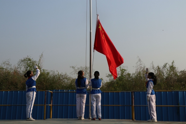 早上八时,迎着晨风,沐浴着朝阳,升旗仪式正式开始了。四名英姿飒爽的护旗手护卫着国旗,迈着矫健的步伐来到升旗台。伴随着激昂的《义勇军进行曲》,全体师生以整齐的队列,面向国旗庄严肃立,五星红旗冉冉升起,高高飘扬在秋日的晴空中。