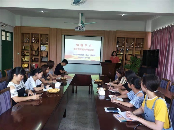 9月11日上午,苏少丽校长则为新教师开展了中秋座谈会。在座谈会上,苏校长充分肯定了新老师开学至今的工作,也让新老师畅所欲言,表达自己在工作上遇到的问题,同时耐心地给予解说和提供帮助。最后苏校长还暖心为新教师送上节日的祝福。当天下午,大丰小学还开展了以“爱国爱家,共话中秋,弘扬传统”为主题的庆中秋主题班队亲子活动。教师和家长们认真布置教室,师生共话中秋,谈中秋的来历与传说,聊中秋的习俗,介绍嫦娥奔月的故事。学生感受着经典文化的博大精深,激发了自身的爱国情怀。活动中学生们还品尝着自己带来的中秋食品,在品尝中加深了对传统节日文化的了解。