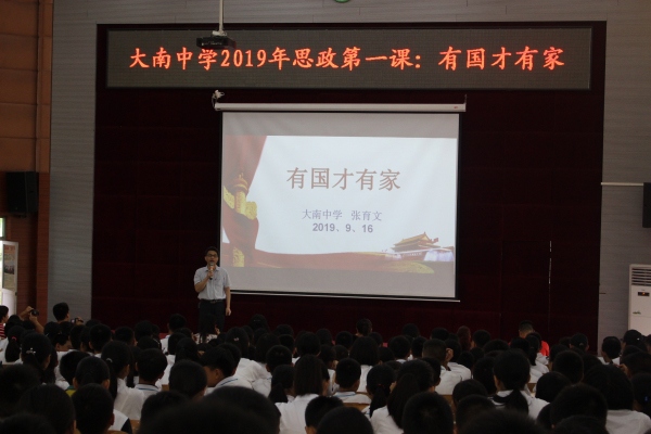 金秋桂花香,明月悬夜空,刚刚结束了中秋小假期,又迎来了新的一周。9月16日上午,港口镇大南中学校长张育文在阶梯教室给全校师生上了一堂精彩的以“有国才有家”为主题的思政课。