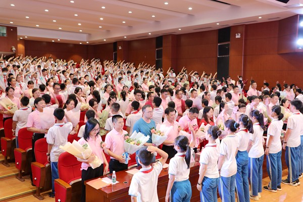 典礼在毕业生表演的诗朗诵《毕业之歌》中拉开了序幕。学生们精神饱满,随着舒缓的音乐,深情款款,道出了对老师的感恩,对母校的眷恋,对同学的不舍。为了表达对老师们的感谢,同学们给全体六年级老师献上鲜花与祝福,全体学生齐声高喊“老师谢谢您,老师您辛苦了”。饱含深情的声音回荡在大礼堂,寄托了孩子们对老师的感恩和不舍。