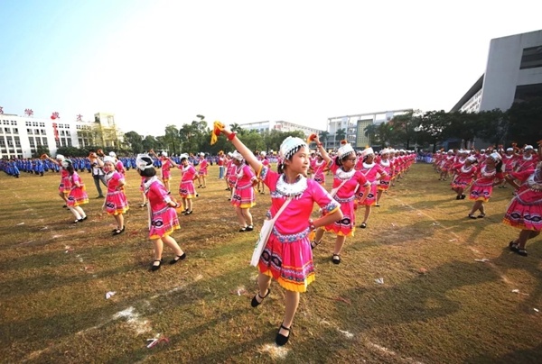 初三年级1100多人分别演绎 “七龙迎春”“喜庆闹春”的春节民俗,“壮怀激烈”的端午民俗,“诗意温存”的中秋民俗,以及“百花齐放”的民族风情民俗。