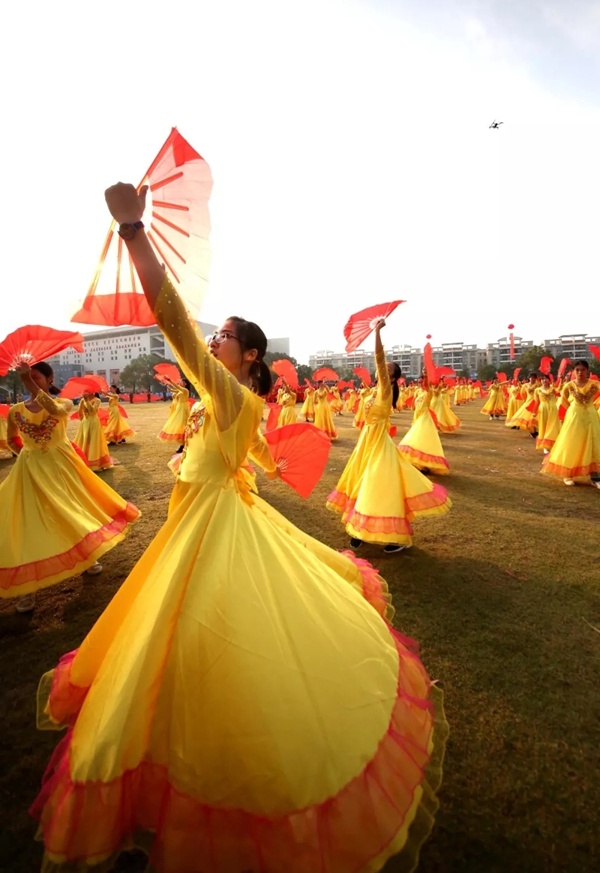 高二年级在《东方红》等音乐中以同心圆、中国心等造型,配以热情的扇舞和旗舞,展示了中国共产党带领全国人民走向光明、走向富强、走向复兴的伟大历程。