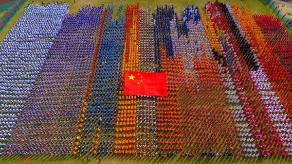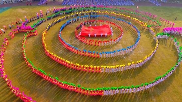 高一年级600余名学生组成体操队,他们身着亮丽的衣裙,挥舞手中的中国红,充分展示了中国人民奋进新时代的精气神。