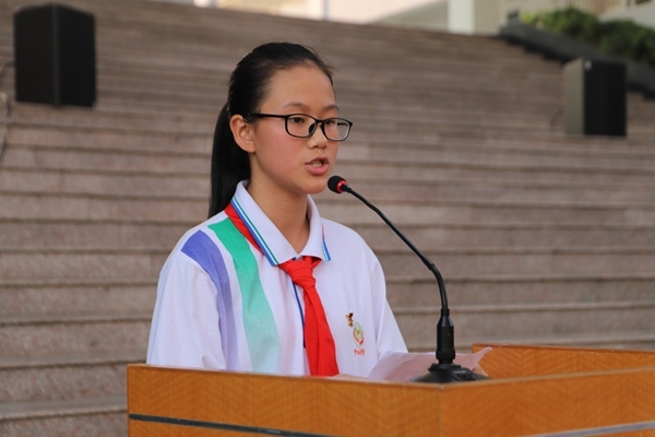 少先队优秀代表初一(18)中队胡晨苗同学发言,倡议大家以模范少先队员的标准严格要求自己,不辜负祖国的期望。