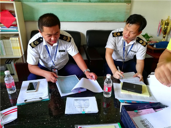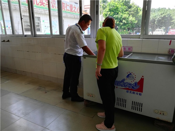 2019年9月11日上午,港口镇食品药品监督所孙思燕专干等一行四人来到港口港源学校食堂检查食品安全工作。刘琳校长和总务主任谢柏高共同迎接了检查组一行人。