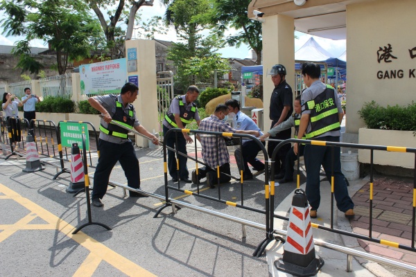 随后,进行的是反恐防暴模拟演练环节。演练开始,一名“歹徒(由学校保安扮演)欲强行闯入校园。学校保安人员立即上前阻止,并让他离开学校。该“歹徒”不听劝告,突然拔出刀具往校内闯,保安们见状立即使用防暴器械围堵“歹徒”,设法将其制服,阻止其进入校园,同时将事件信息第一时间向值班行政和校领导汇报,按下110报警器,等待警方救援。