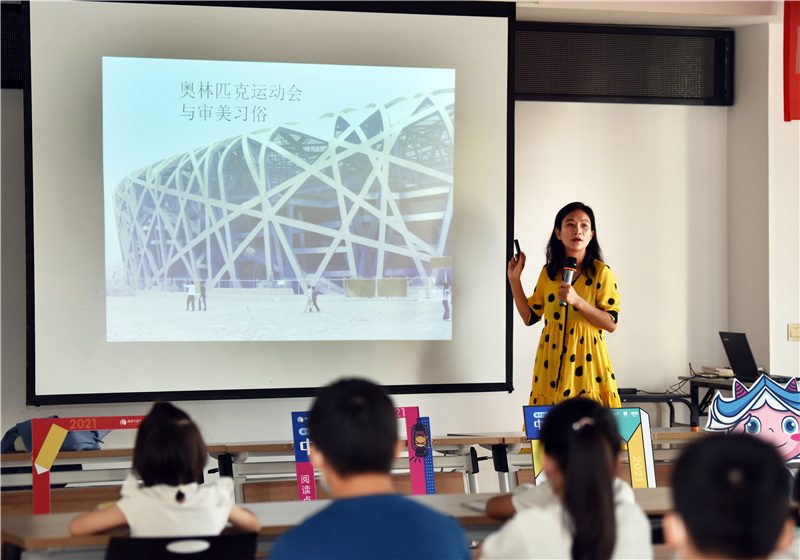 阮波从近期东京奥运会讲起,从“奥林匹克运动会与审美习俗”,到东西方神话人物在衣服穿搭、妆容、人物性格塑造的异同及戏剧人物的审美比较,论证“真”“善”“美”的辩证联系。过程中阮波不时提问,邀请亲子家庭互动作答,引导家长从小注重对孩子审美能力的培养,并推荐相关阅读书目。
