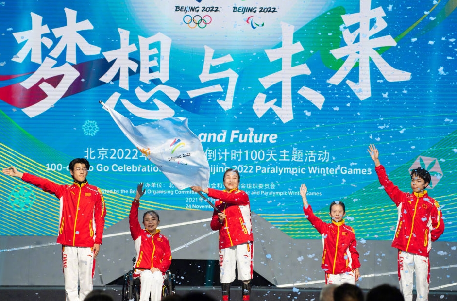 日前,北京市冬奥示范助残社会组织的50多名代表受邀在国家体育馆举行了冬残奥会倒计时100天快闪活动。