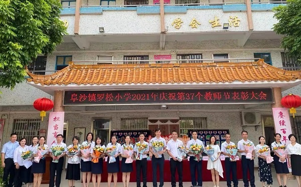 梁柱明校长首先发表讲话,汇报了上一个学年罗松小学在上级领导的关怀下、家长的配合和社会各界的支持下,教学成绩质量优异,教科研成果丰硕,一大批师生获得了不同级别的各项奖励,其中学校获得了2020年度阜沙镇教学质量评价一等奖、阜沙镇德育管理单位一等奖、阜沙镇强师工程一等奖、阜沙镇教育装备评价二等奖。学生代表六年级3班王梦悦发言,向可爱可敬的老师们献上同学们真诚的祝福。