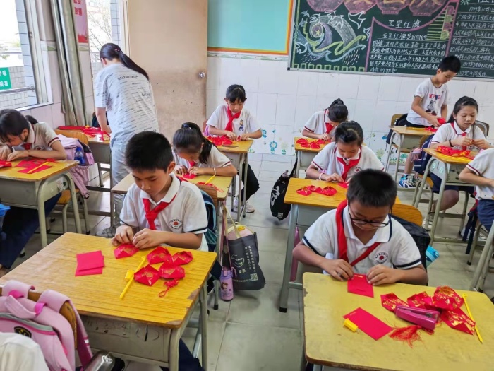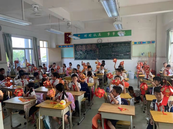 部分班级利用班会课开展手工制作灯笼活动,家委们先向同学们介绍了中秋节的来历与习俗。接着,向同学们展示了中秋节灯笼作品,为所有同学分发了材料包,介绍了材料包里的工具。随后,详细地为同学们介绍灯笼的制作方法,同学们都很认真听和观察,听完介绍后都迫不及待地开始动起手来。同学们按照制作步骤,先把灯笼框架组装好,然后在红包纸上涂上胶水,接下来在骨架上粘好红包纸。在同学们的努力下,一个个精美的中秋节灯笼制作完成。