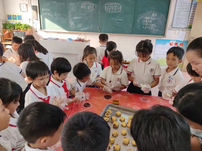 部分班级利用班会课,结合德育校本课程《巧手做美食,味浓情更浓》,组织各班开展了手工制作月饼活动,让学生通过自己的劳动,体验亲手做月饼的乐趣,把第一次动手制作的月饼与家人一起分享,使学生体验与他人分享带给自己的快乐。各班家委会成员与学生全程参与活动,全体学生亲自体验了做月饼的全过程。无论是裹馅儿、模具制型,还是烘焙、包装,各环节做得有模有样,师生与家委乐在其中。经过同学们的巧手加工,一个个像模像样的月饼新鲜出炉了。最后同学们一起品尝月饼,分享自己的劳动成果。学生通过制作月饼的方式送祝福,充分体现了学校的育人特色。中秋是中国传统节日,用做月饼这样的传统方式,表达对祖国的祝福,更是少先队员对祖国的献礼。