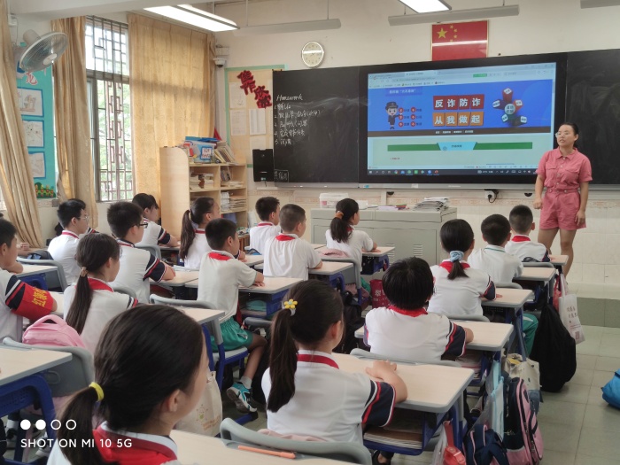在课上,老师结合中山反诈骗网站的动漫视频以及警官分析的诈骗案例,为孩子们讲解五花八门的电信诈骗,更讲解了怎么预防,和被骗后怎么做。主题班队活动结束后,学生都知道自己被骗后最关键就是要抓紧“时间”,要抓紧时间冻结自己的相关号码信息,而最有效的防范手段就是:心头切莫有贪念,只要牢牢记住“天上不会掉馅饼”!就可以大大降低上当受骗的几率。