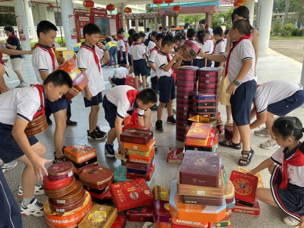 全校师生积极响应学校的倡议,并参与了“绿色中秋饼盒变宝盒,回收换回馈——月饼盒回收”中队活动。少先队员们纷纷从家里带回来了各种精美的月饼盒,在各中队家长志愿者的协助下,齐心协力对月饼盒进行了整理和分类,全校共收集到月饼纸盒328个,月饼铁盒650个,一共978个。