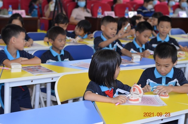 为更好地贯彻落实《学校卫生工作条例》《健康口腔行动方案(2019-2025年)》和《健康中山行动(2020-2030年)》等有关要求,提高小学生口腔健康素养水平,降低儿童龋齿发生率,9月23日下午,2021年中山市教育系统“全国爱牙日”现场宣传活动暨2021年小学生口腔健康服务项目正式启动,本次启动仪式由中山市教育和体育局主办,中山市中小学卫生保健所、南区马岭小学承办。中山市教育和体育局三级调研员容彤、中山市中小学卫生保健所黄思哲所长、南区教育和体育事务中心刘敏斯副主任、有关镇街卫生专干、各项目学校项目负责人、马岭小学二年级的师生一同参加了此次活动。