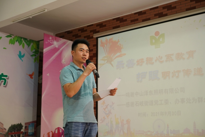 接着爱心企业代表——中山泽东照明有限公司项目副总经理金起发叔叔进行了发言。金叔叔从青少年近视的现状、近视与学校家居环境的关系等方面呼吁青少年要高度重视视力健康。希望同学们保护双眼,用心学习,努力成为祖国的优秀人才。