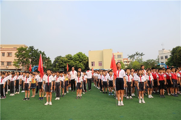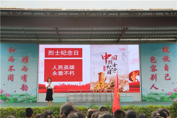 八点整,校园里响起庄严的国歌,鲜艳的五星红旗缓缓升起,在场师生肃然而立,向国旗行注目礼,少先队员行队礼,进行国家烈士纪念日升旗仪式。全体师生通过观看爱国影片《祖国不会忘记》、聆听黄嘉欣主任的发言《缅怀先烈 红色故事传承革命精神》、全体师生齐唱《少年》和《中国少年先锋队队歌》等方式深切缅怀为民族独立、人民解放、国家富强、人民幸福英勇献身的革命先烈,传承弘扬革命精神,不忘初心、牢记使命。