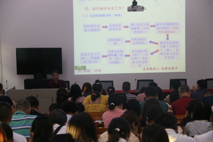 黎碧东校长首先肯定了开学以来全体老师在配合学校疫情防控、加强校园值班、落实学校安全管理要求等方面的良好表现,认为正是全体老师的辛勤付出,才保障了学校各项工作的顺利开展。其次,在国庆节即将来临之际,黎碧东校长也把当前全国疫情防控的形势向全体老师做了通报,并从校门口安全、刀具管控、食品安全、交通安全、消防安全、防溺水安全、防小孩独居安全、疫情防控(新冠肺炎疫情、季节性传染病)等涉及校园安全的各个方面提出了详细的要求。同时,为了确保工作的顺利开展,黎校长也把学校的安全管理架构、应急处置流程、请假的相关流程等再次跟全体老师进行了学习和培训。