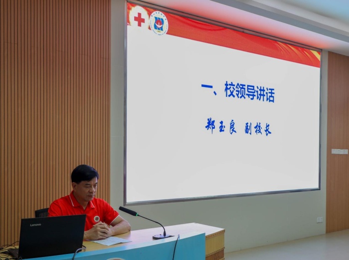 本次大会在庄严的国歌声中拉开了序幕。市侨中党委委员、副校长郑玉良作讲话。他首先与大家一起回顾了校红十字会的创办历史和辉煌成绩。在往届校红十字会成员的努力下,市侨中曾荣获 “广东省红十字模范校”、 “中山市‘六有’红十字示范校”等称号。在过去一个学年里,校红十字会围绕主题,开展了一系列卓有成效、意义重大的活动,如慈善万人行、旧书回收义卖等。郑校长在讲话中充分肯定了往届成员的努力和取得的成绩。同时,他还深切地勉励本届成员继续努力,一如既往地秉承和发扬“人道、博爱、奉献、关怀”的红十字精神。讲话最后,他殷殷嘱托各位成员,要牢记红会使命,践行红十字精神;提升急救技能,传播急救知识;汇聚集体力量,携手奉献社会。