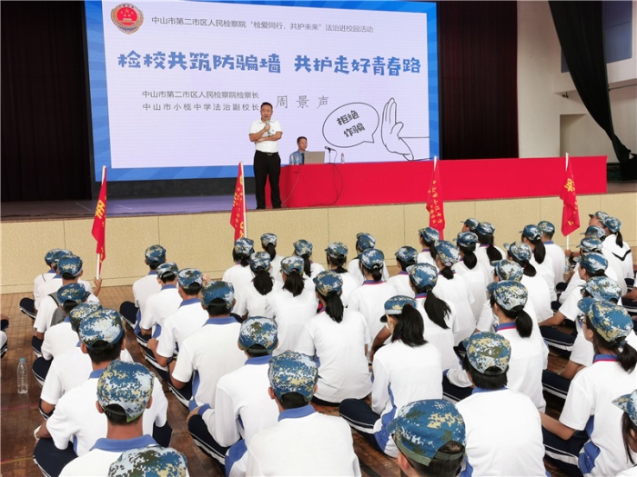 10月12日,中山市小榄中学新生军训正在如火如荼地进行着。军训,既是训练身体的重要时刻,更是全面育人的重要时机。在当天的军训中,中山市第二市区人民检察院检察长、中山市小榄中学法治副校长周景声同志来到学校,为全体学生带来法治讲座——《检校共筑防骗墙 共护走好清纯路》,学校范卫平校长陪同并感谢周检察长对新生的关爱和呵护,对学校工作的关心和支持。