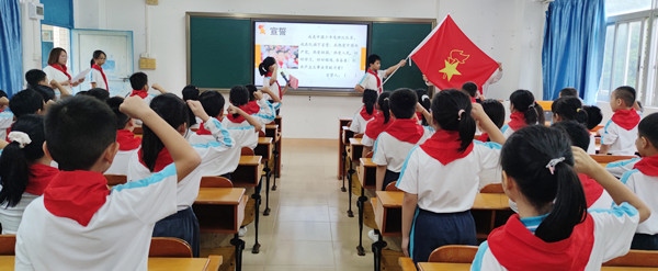 激动人心的时刻终于来了。随着庄严激昂的出旗曲,朝气蓬勃的旗手迈着整齐的步伐出旗。少先队员们敬队礼,唱队歌,眼里满是尊敬与自豪。紧接着,大队辅导员杜老师宣布了新队员名单。星星火炬,薪火相传。五年级的老队员为二年级的新队员佩戴红领巾,互敬队礼。老队员与新队员之间的互动,是一种荣耀的传递,也是一份责任的嘱托。 随后,大队长带领队员们在队旗下庄严宣誓。二(1)中队陈建亮同学作为新队员代表发言,表达了加入中国少年先锋队的兴奋和喜悦,并下定决心,立志要做一名优秀少先队员。少工委主任梁容根同志也为新队员送上了寄语,他希望队员们能够多学知识、多学本领、锻炼体魄、塑造健全人格。最后,庄严的入队仪式在队员们铿锵的呼号声中渐渐拉下帷幕。